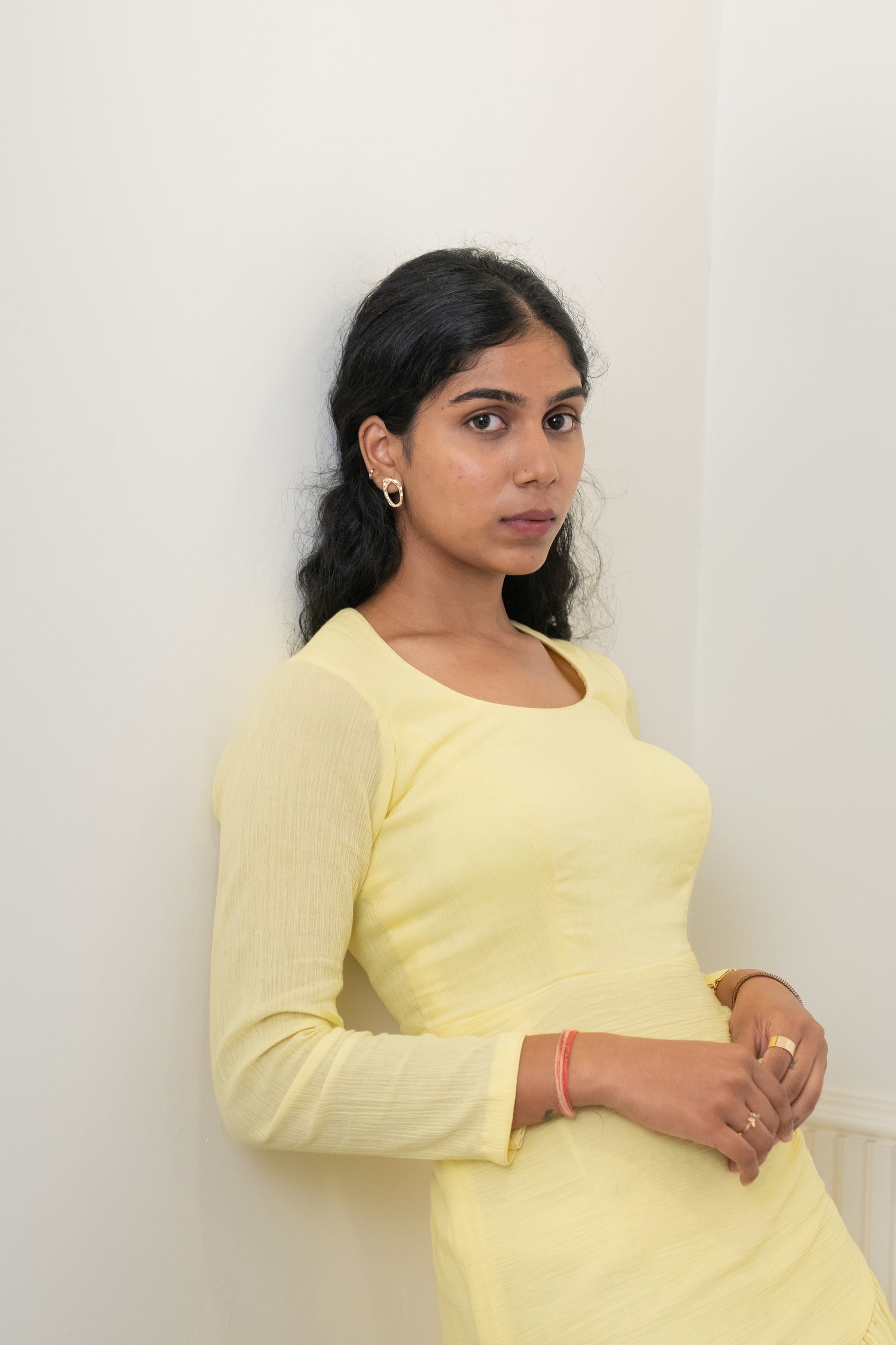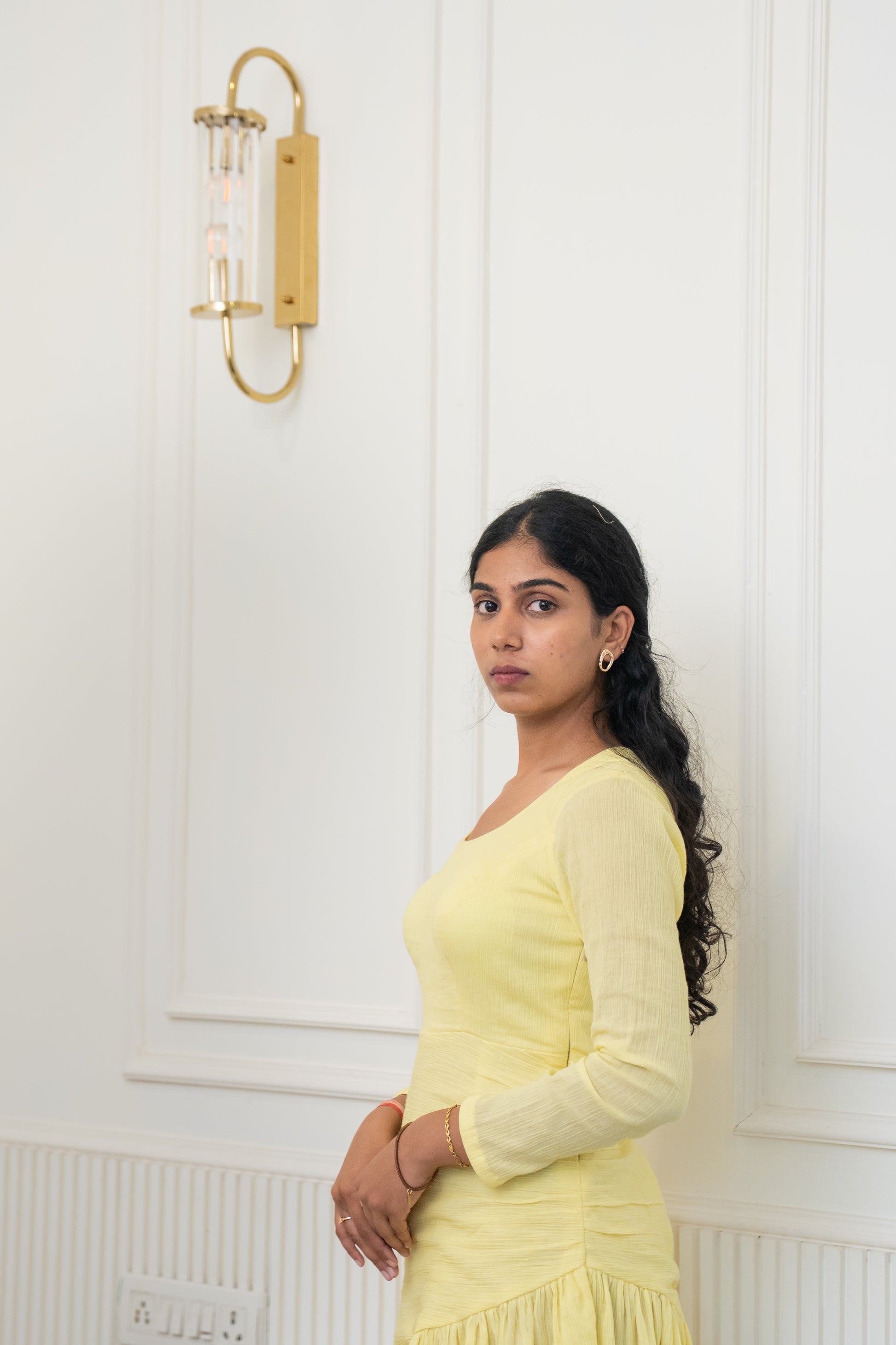 A scoop neck butter yellow full sleeve dress made out of a soft breathable fabric with a fitted bodice that enhances the waist line- gathered pleats starting at an angle, creating asymmetric hemline that adds movement and elegance. The fabric has a subtle textured finish, contributing to a chic style.