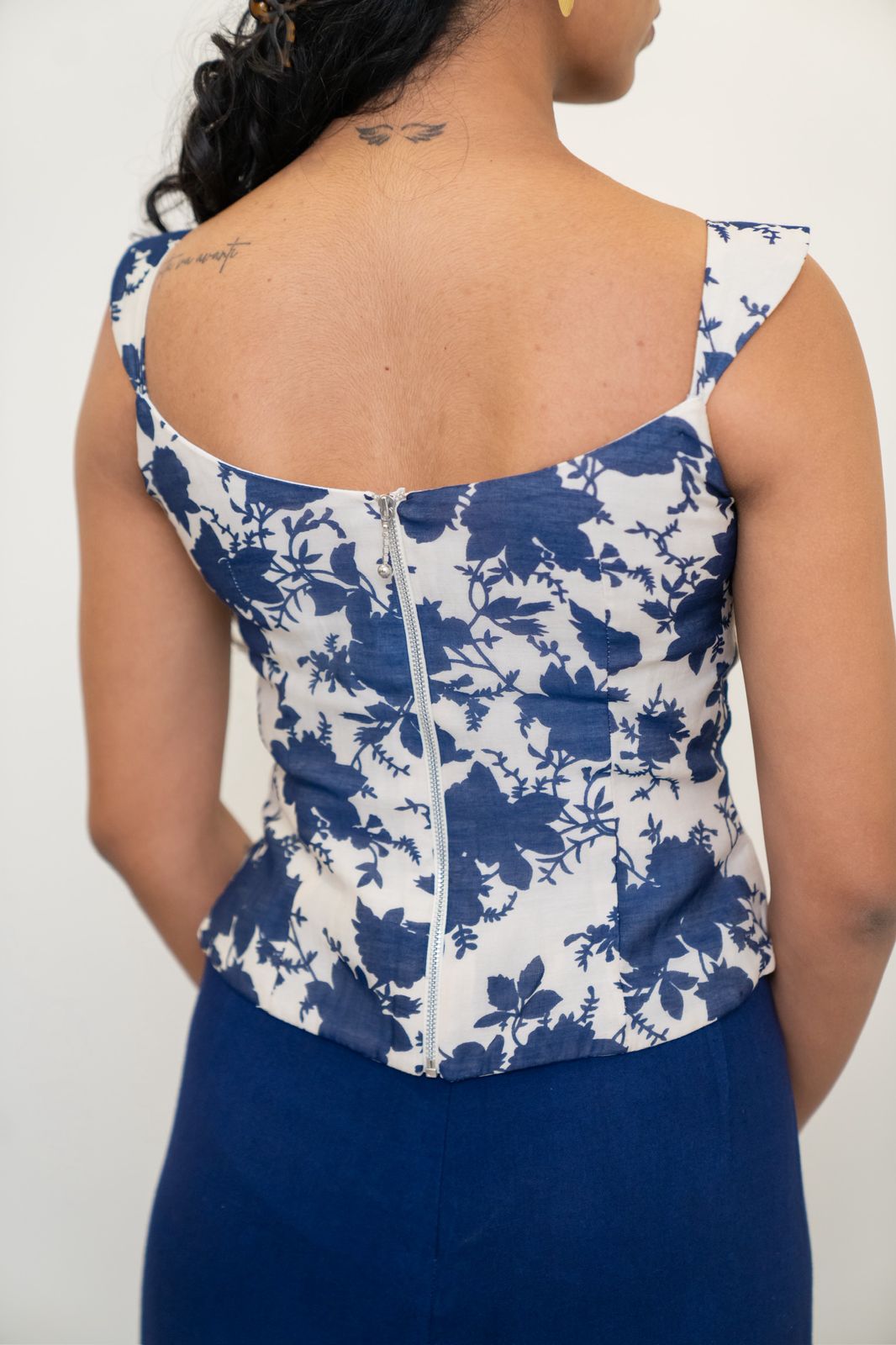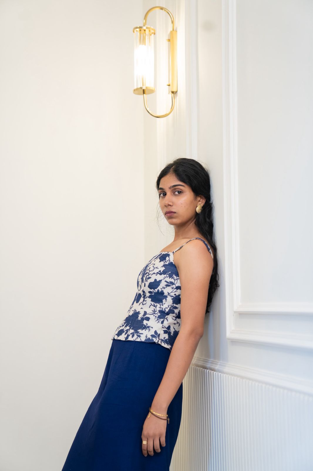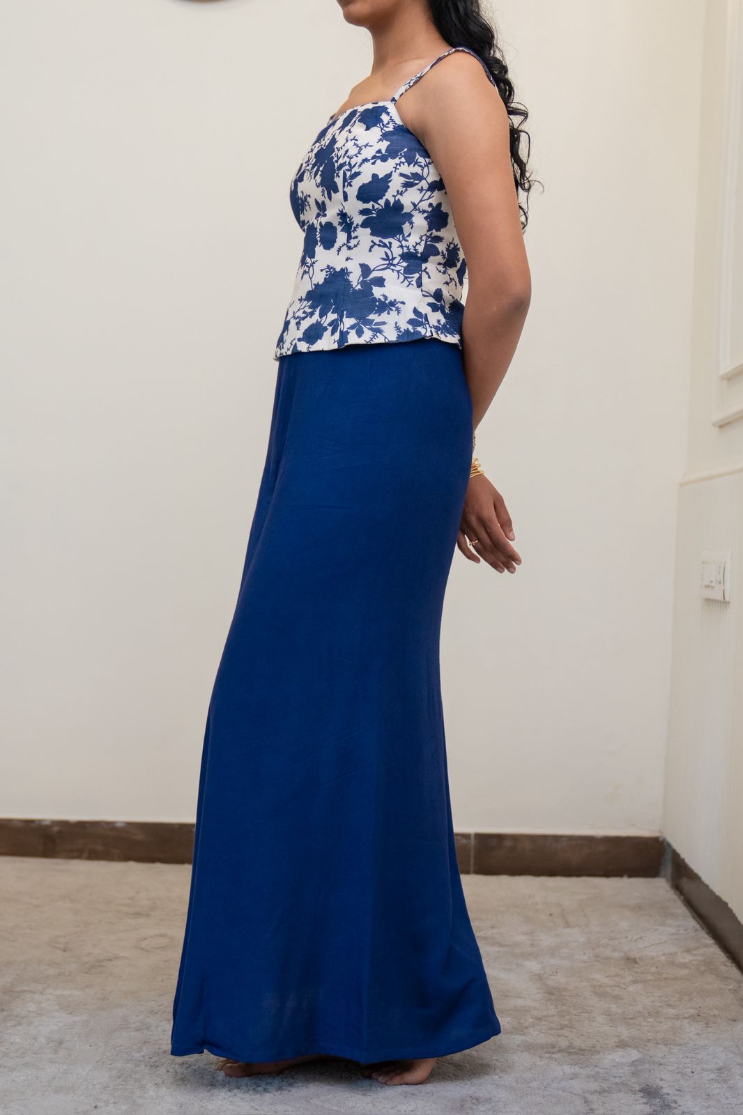 This fit features a floral-printed, sleeveless fitted top, designed to contour the upper body while showcasing the vibrant beauty of blooming patterns. The floral print adds a charm when Paired with a fitted solid-colored skirt, the outfit balances visual interest with clean structure. The skirt hugs the hips and falls smoothly offering a streamlined silhouette that contrasts beautifully with the lively top.